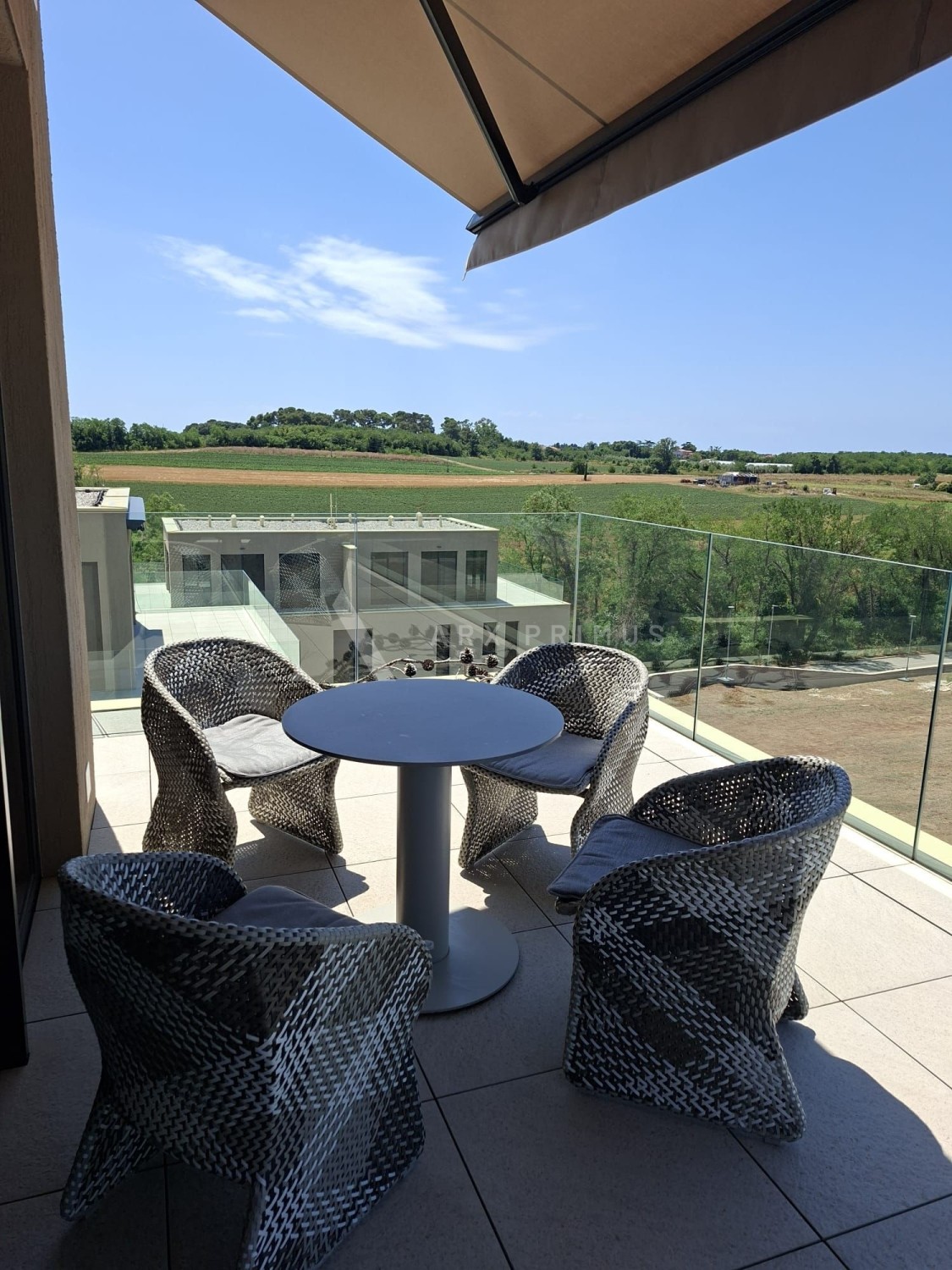 Zum Verkauf steht eine exklusiv eingerichtete Maisonette-Wohnung mit 3 Schlafzimmern, 4 Badezimmern und einer großzügigen Dachterrasse mit Panoramablick auf das Meer, gelegen im renommierten Petram Resort & Residences in Crveni Vrh bei Umag.