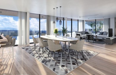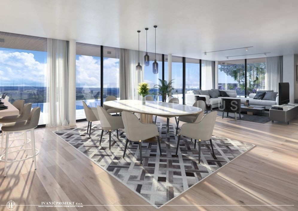 Sie erstreckt sich vom Keller, wo sich ein Parkplatz sowie ein Fitnessraum und eine Sauna befinden, über das Erdgeschoss mit einem Wohnzimmer mit Küche, Badezimmer, Terrasse und einem angelegten Innenhof mit Infinity-Pool bis hin zum 1. Stock mit 4 Schlafzimmern und 3 Badezimmern.