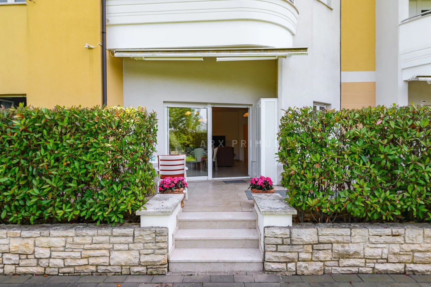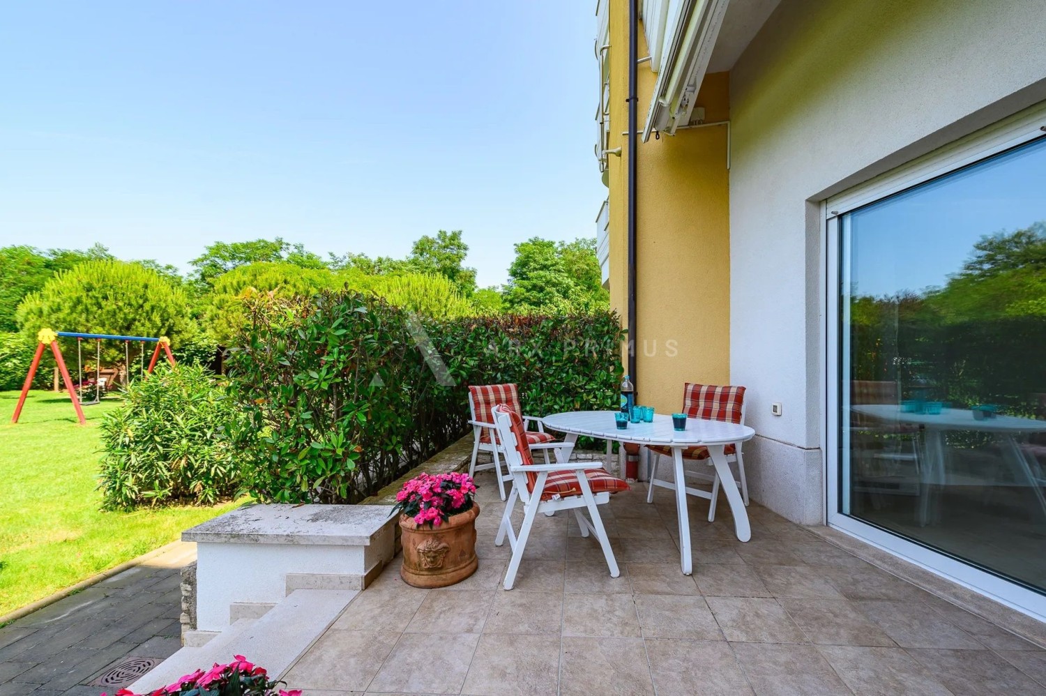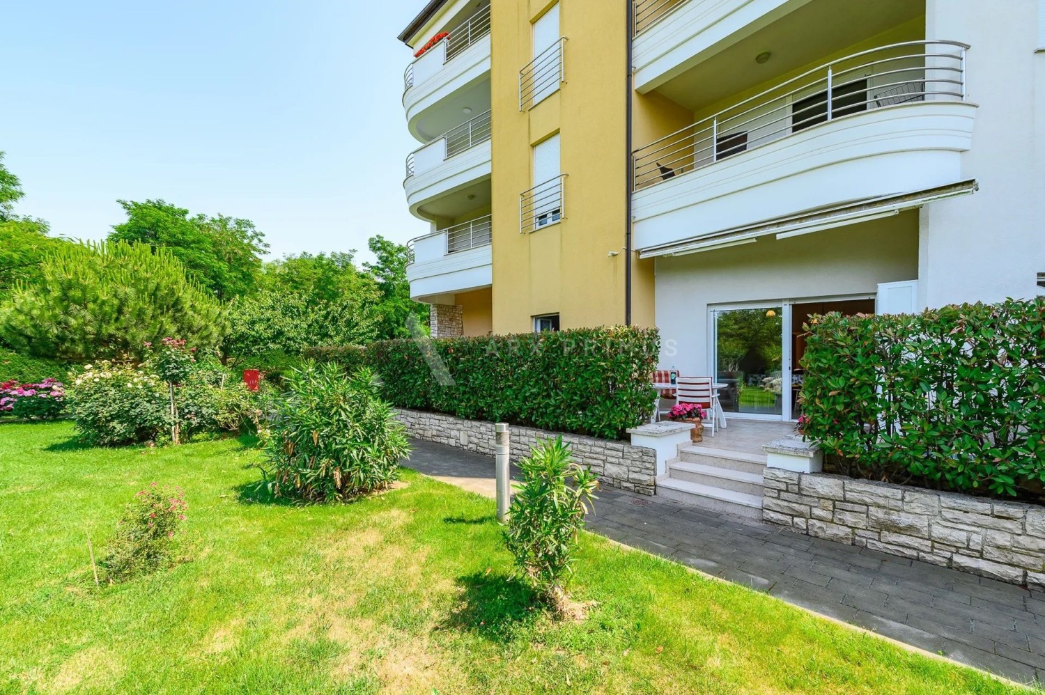 The apartment is located on the ground floor and has 2 bedrooms, a bathroom, a living room and a kitchen, as well as a large terrace that leads to a beautifully landscaped garden.