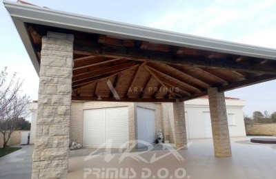 Vila ima prostrano i lijepo uređeno dvorište popločano kamenom i pločicama, te kovanu ogradu. U sastavu vile su i dva garažna mjesta.